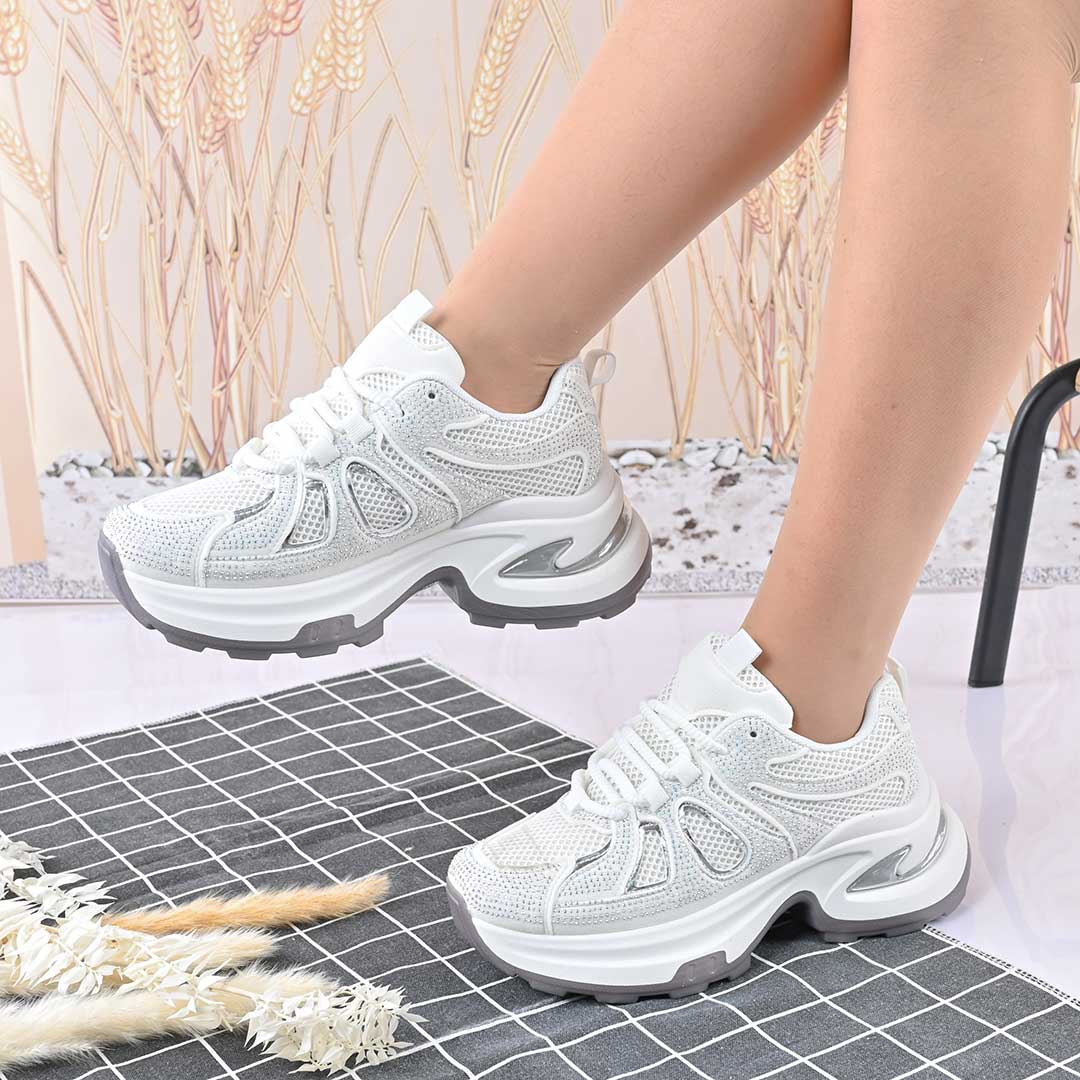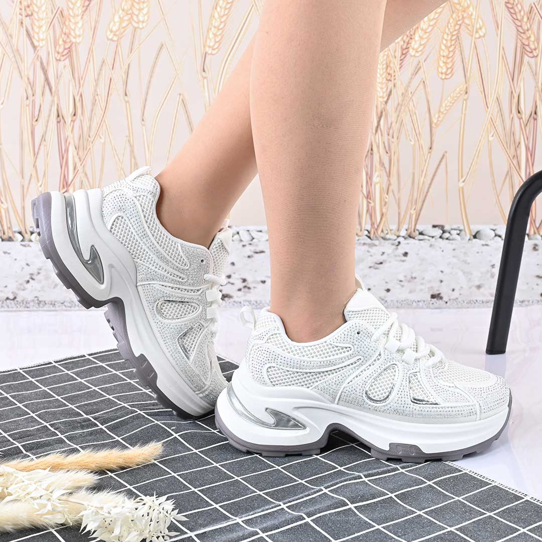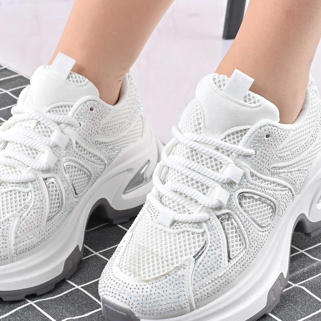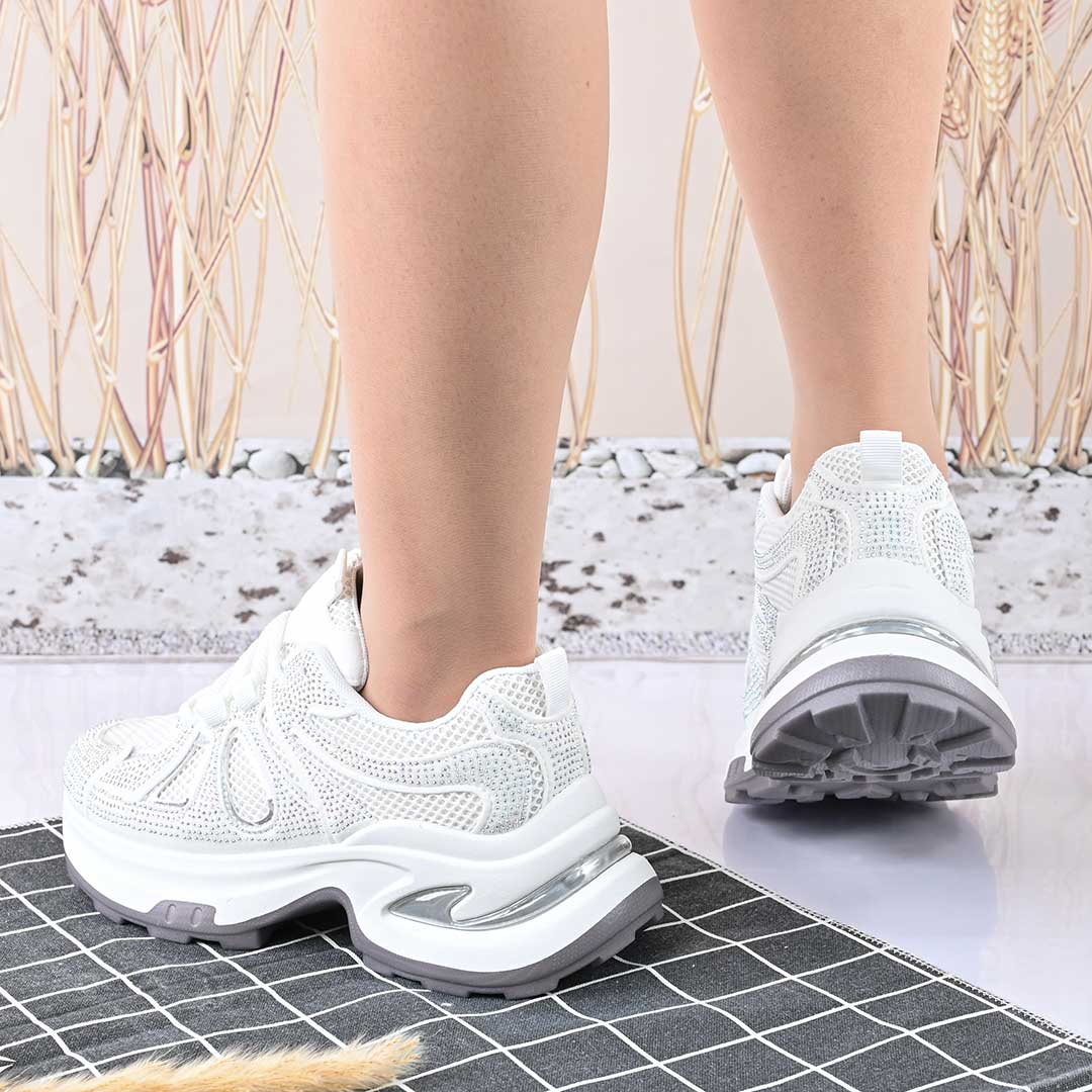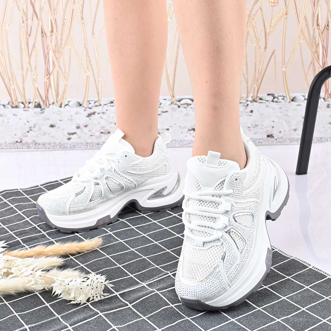 Дамски спортни обувки, с мрежести вложки и кристали, D1415, бели