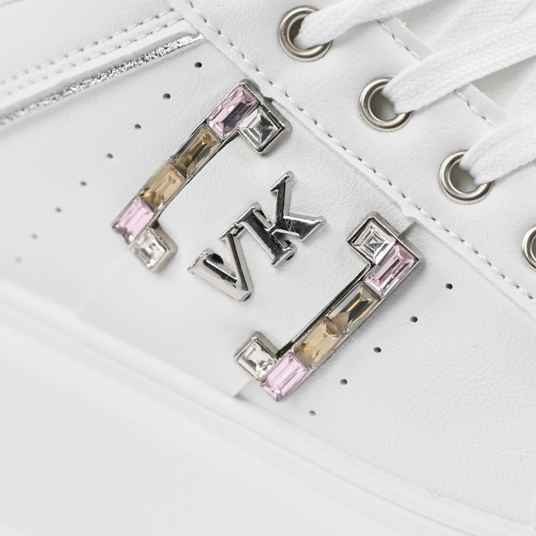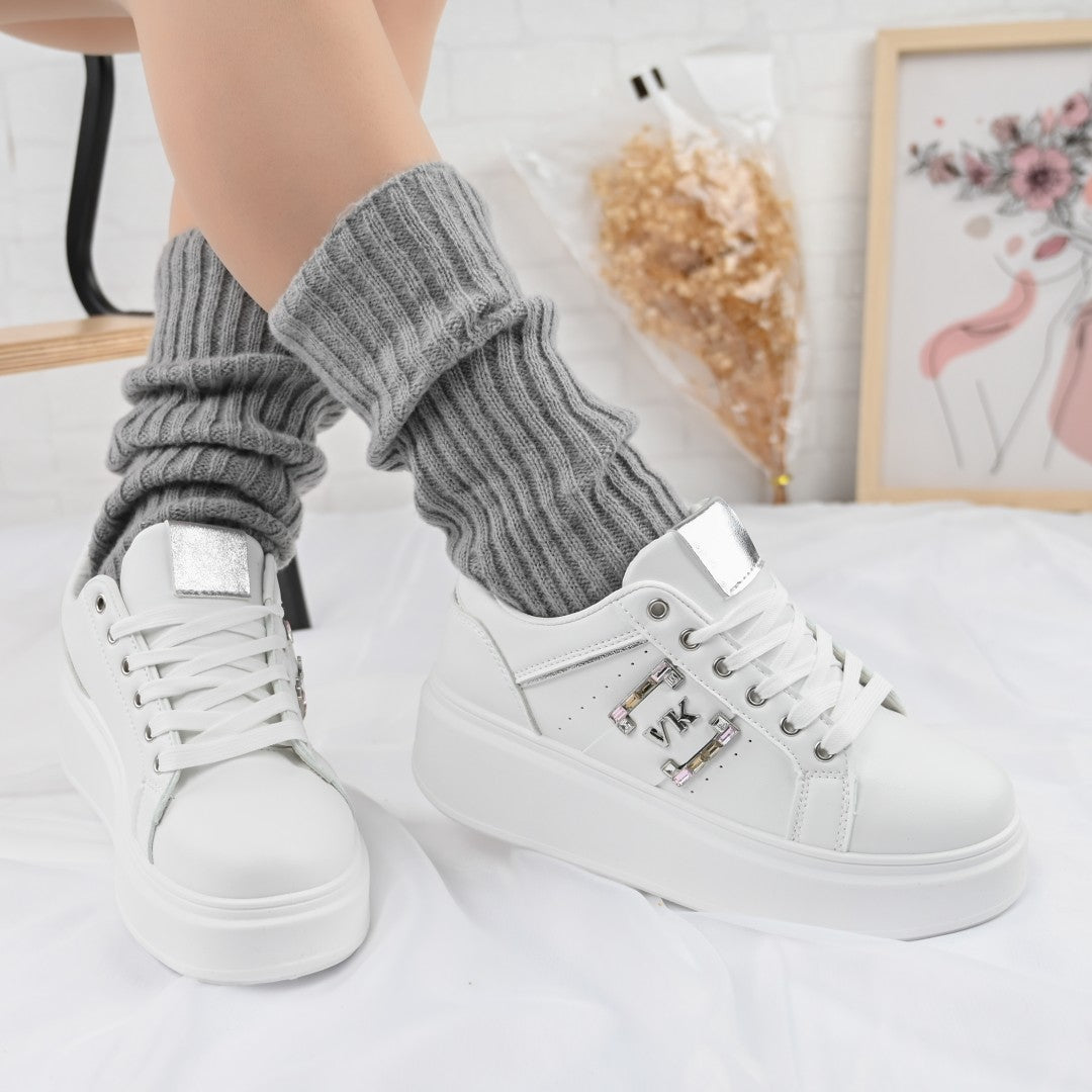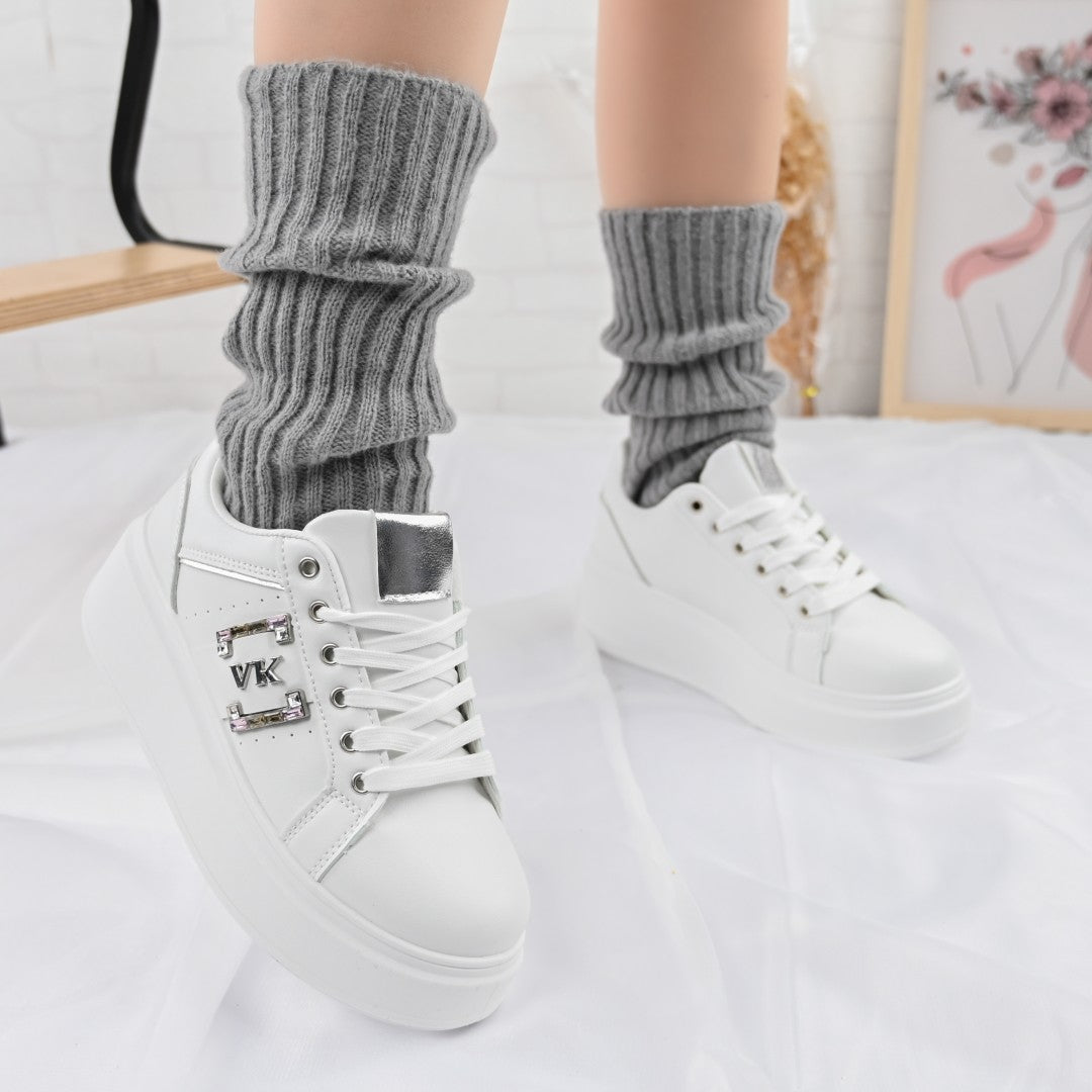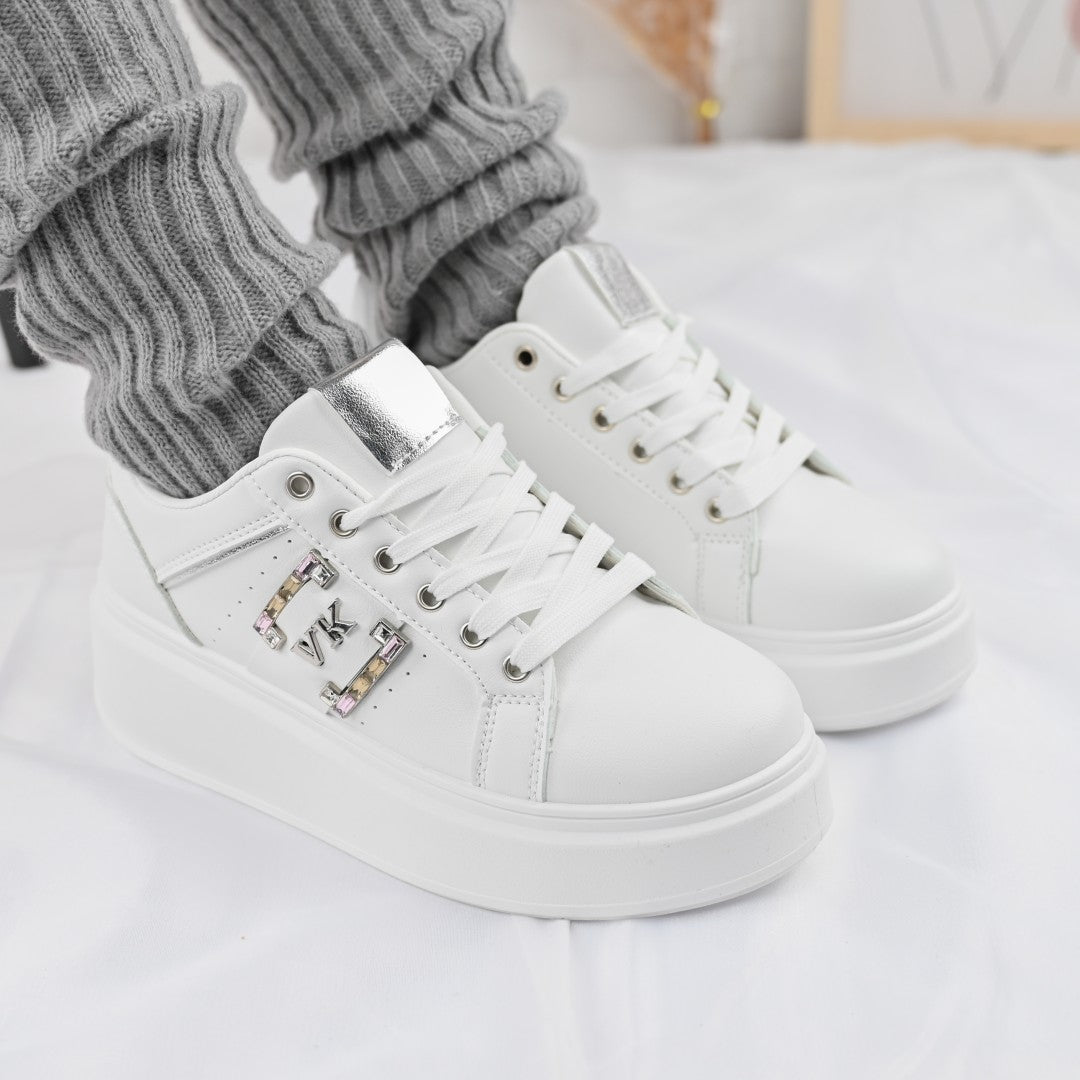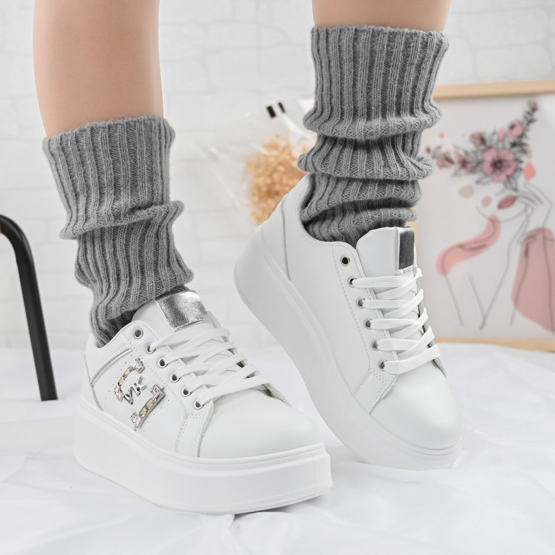 Дамски спортни обувки, изработени от екокожа, с камъни, D1368, бели със сребристо