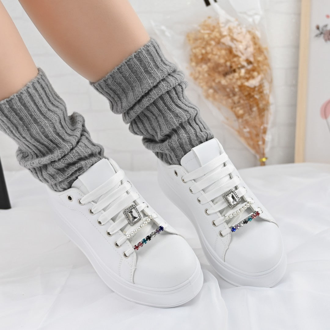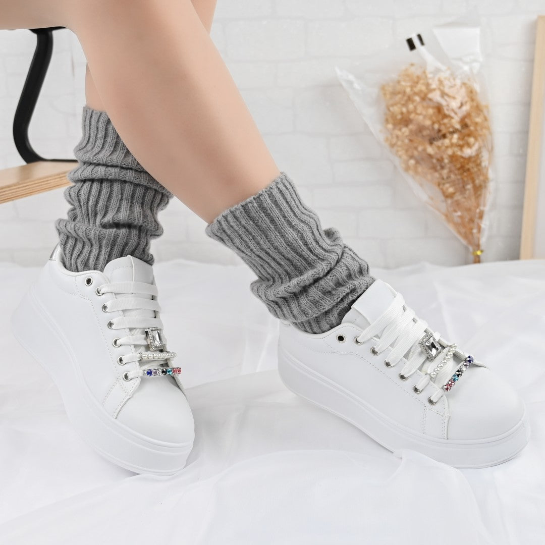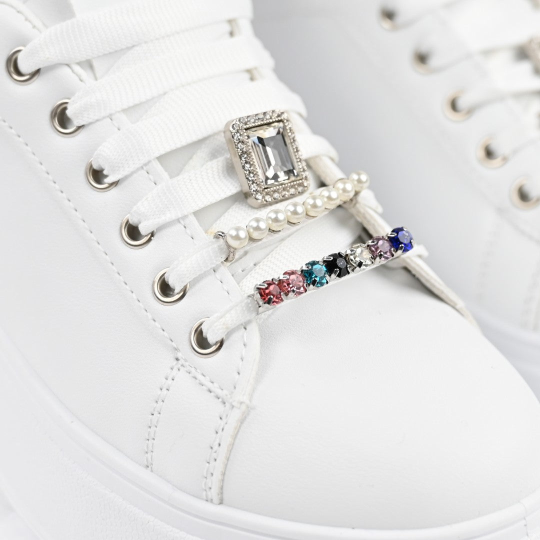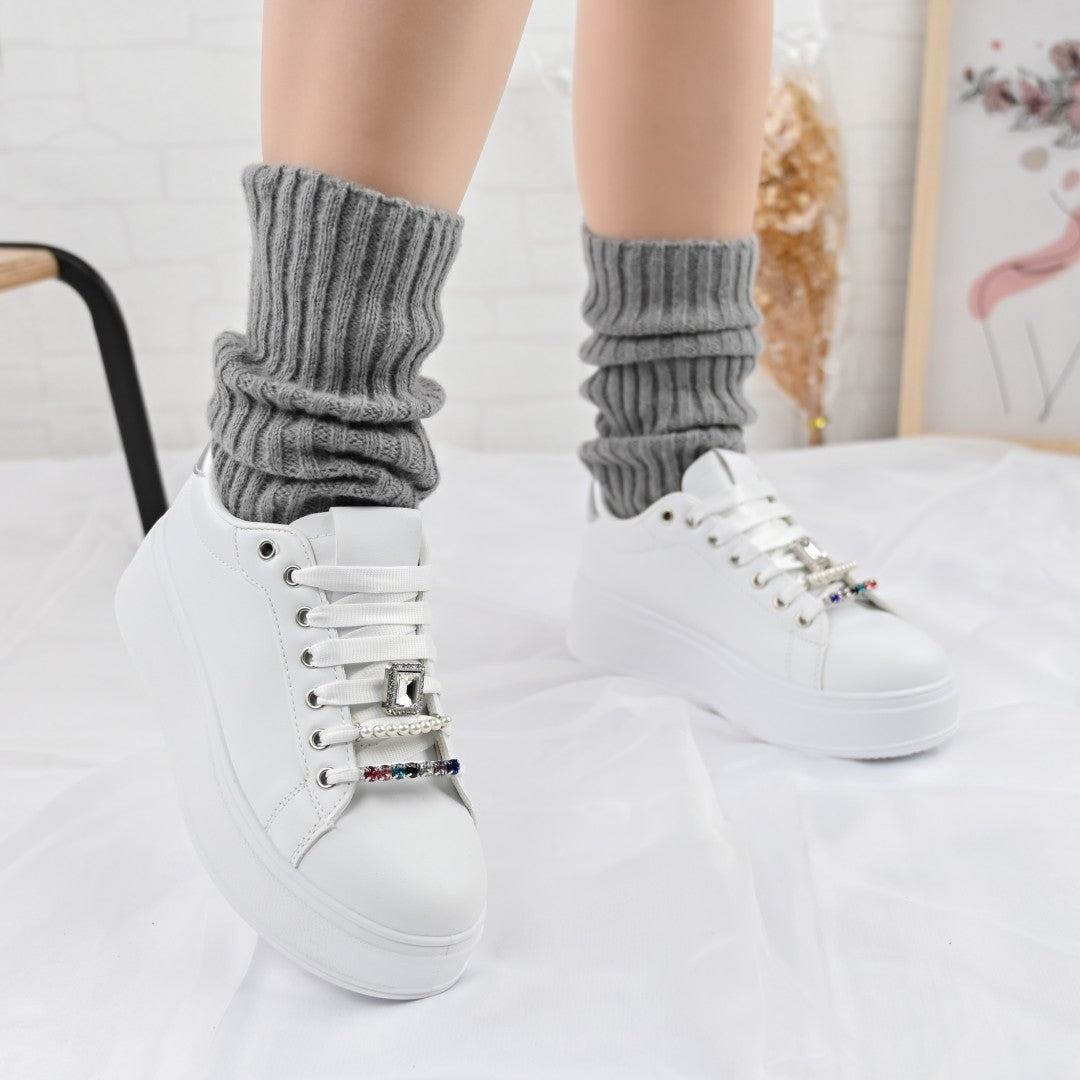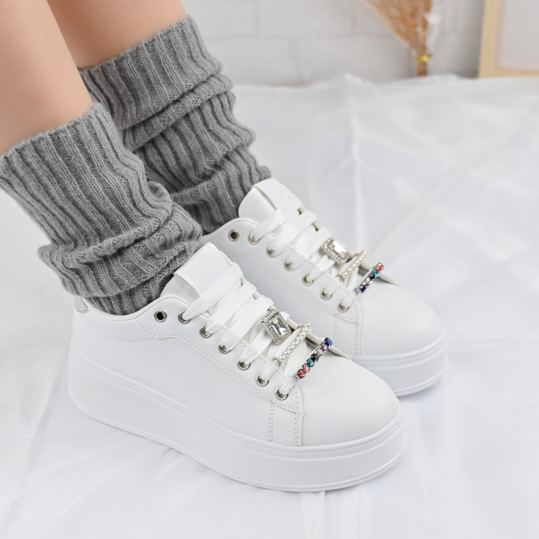 Дамски спортни обувки, Изработени от екокожа, С камъни, D1374, Бели със сребристо