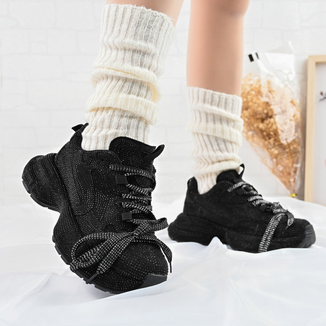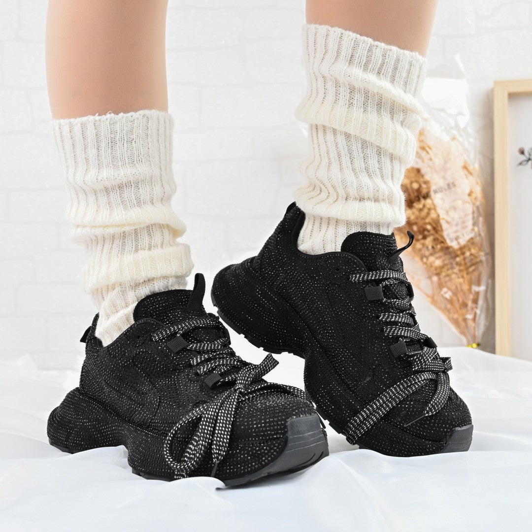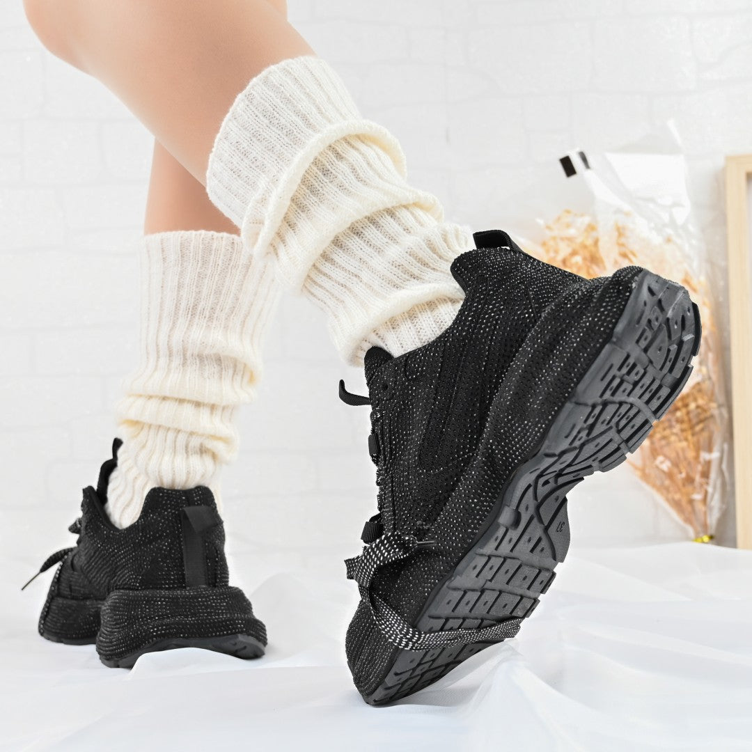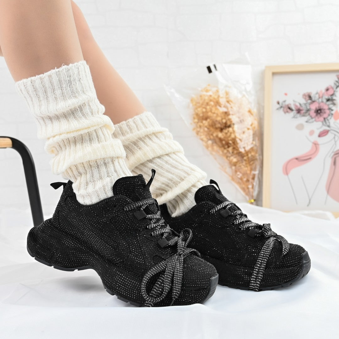 Дамски спортни обувки, изработени от еко-велур кожа, с кристали, D1397, черни