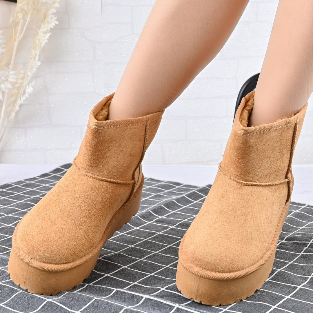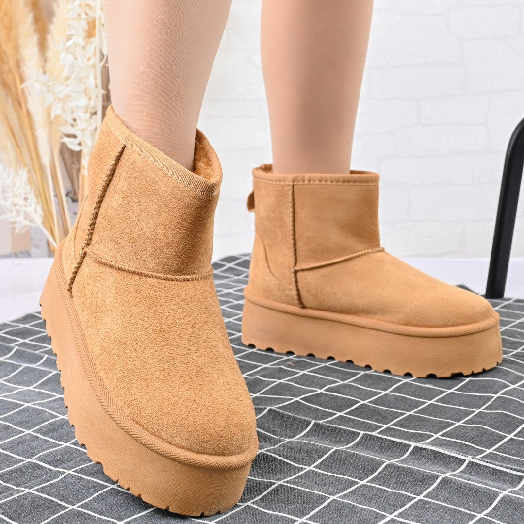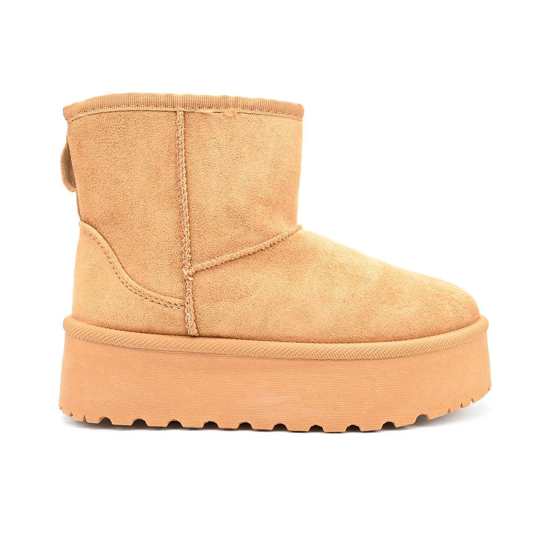 Cizmele de damă tip Ugg, din piele întoarsă camel, sunt imblănite pentru confort termic în sezonul rece. Cu sistem de...
