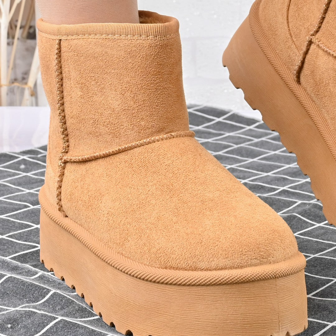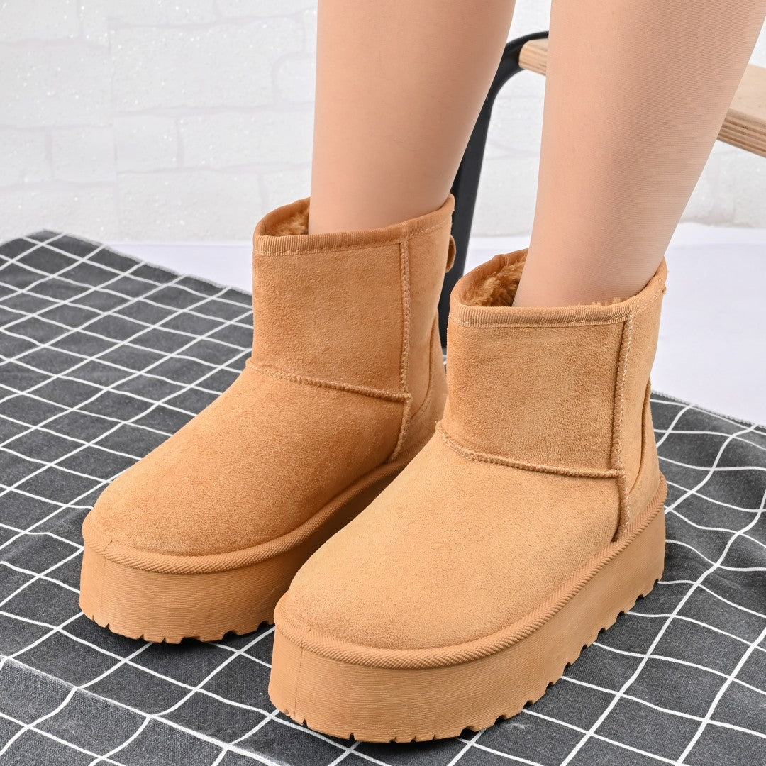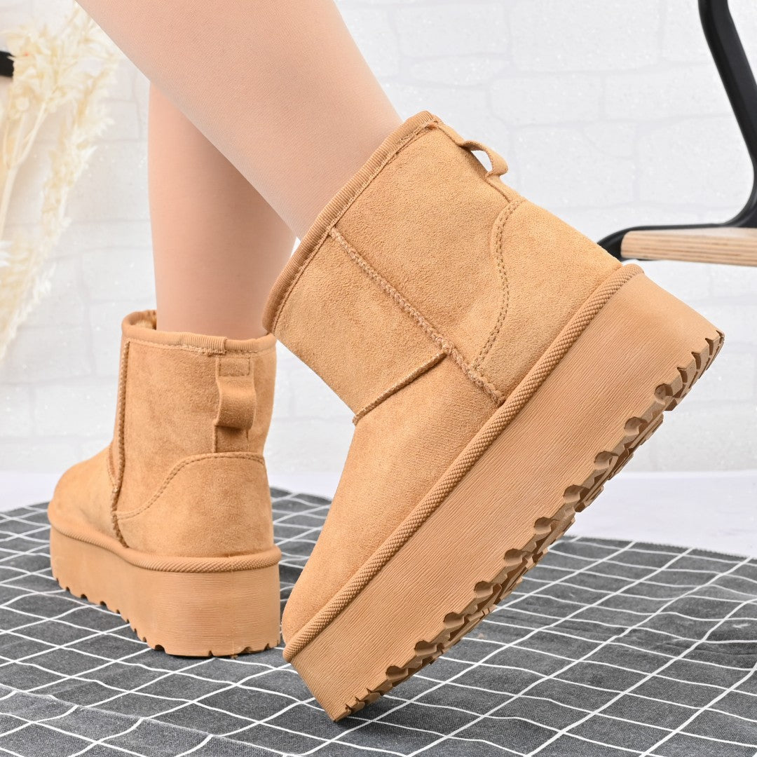 Cizmele de damă tip Ugg, din piele întoarsă camel, sunt imblănite pentru confort termic în sezonul rece. Cu sistem de...