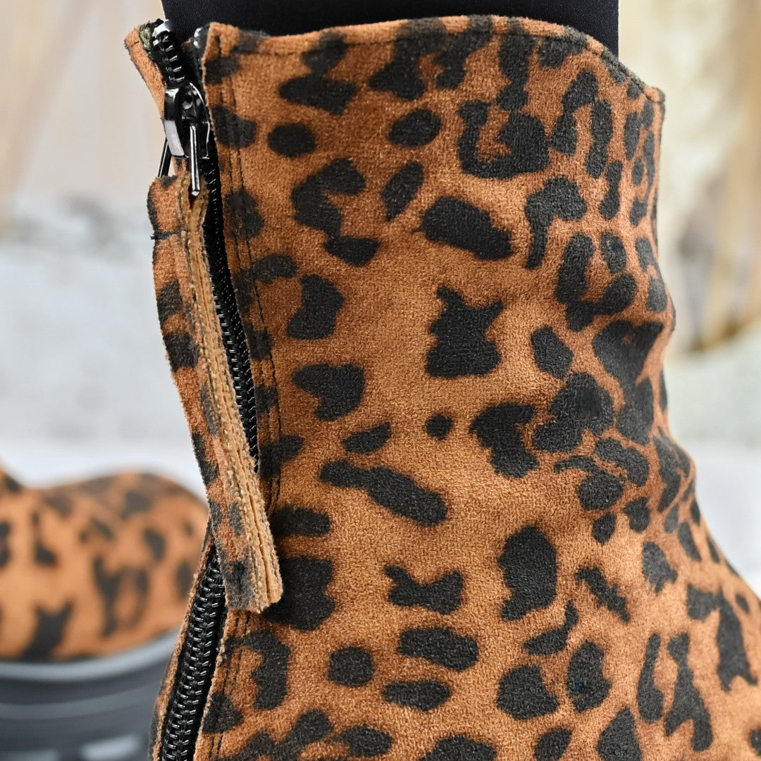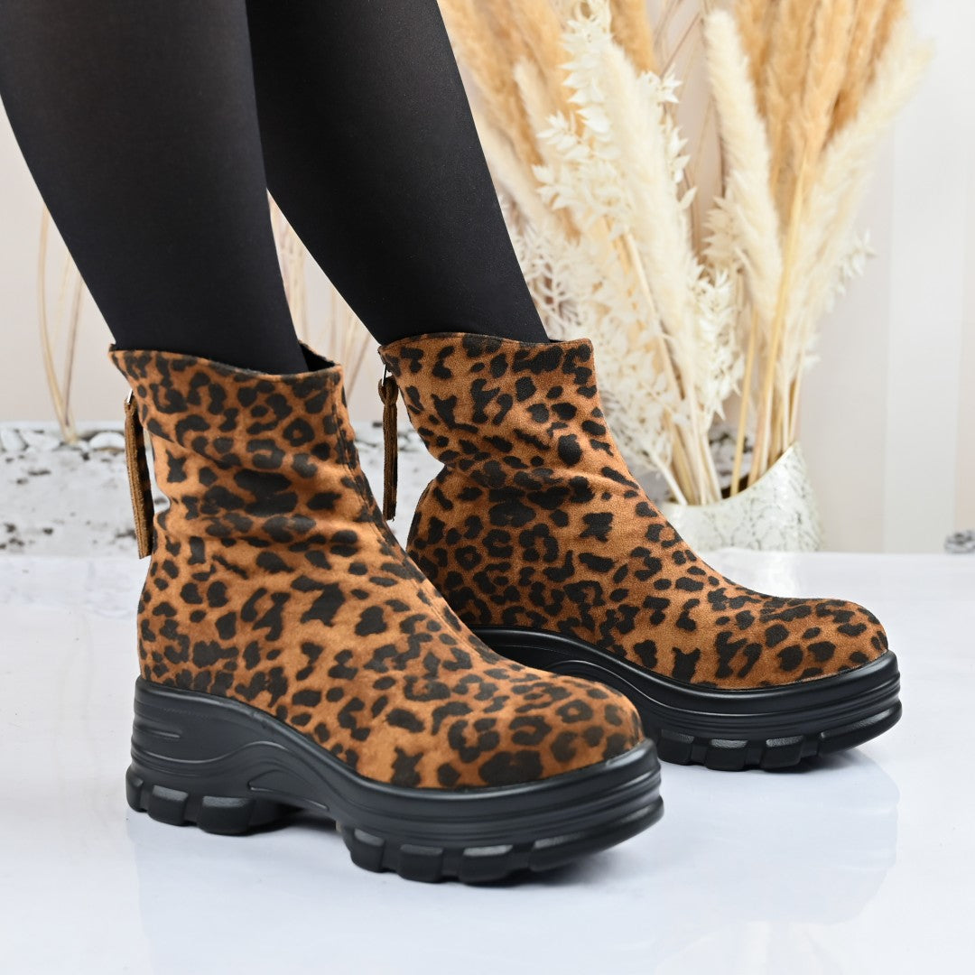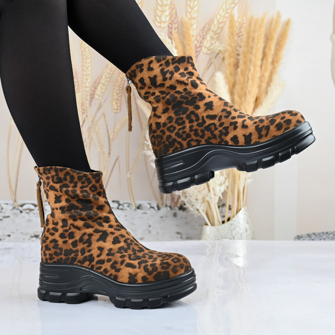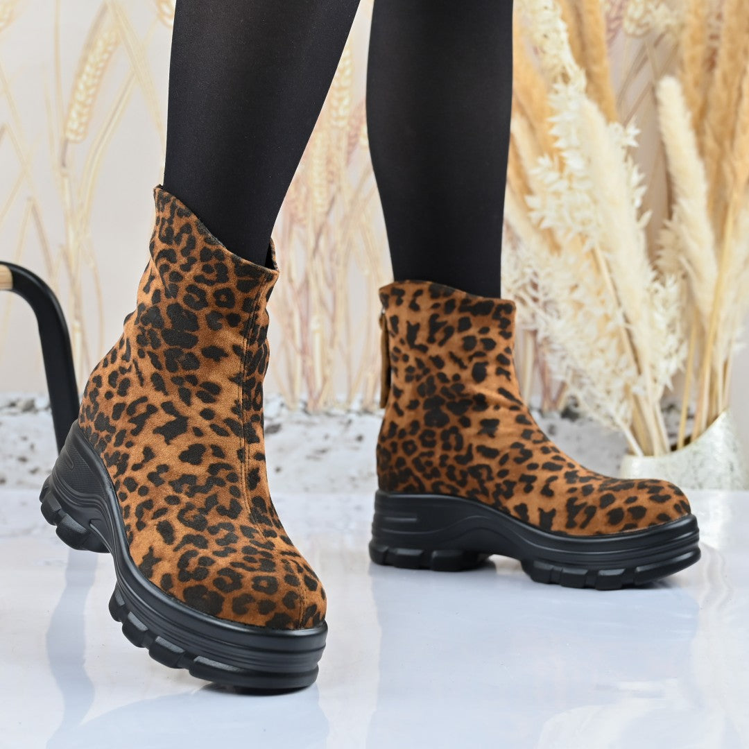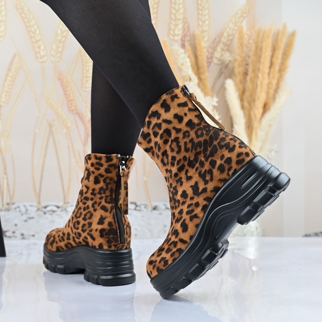 Ghete elegante de damă din piele ecologică cu interior îmblănit, ideale pentru zilele friguroase. Design leopard, fermoar practic și talpă...