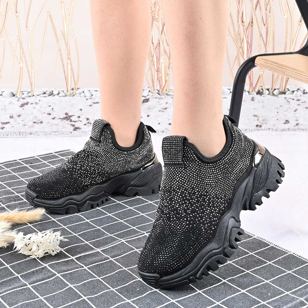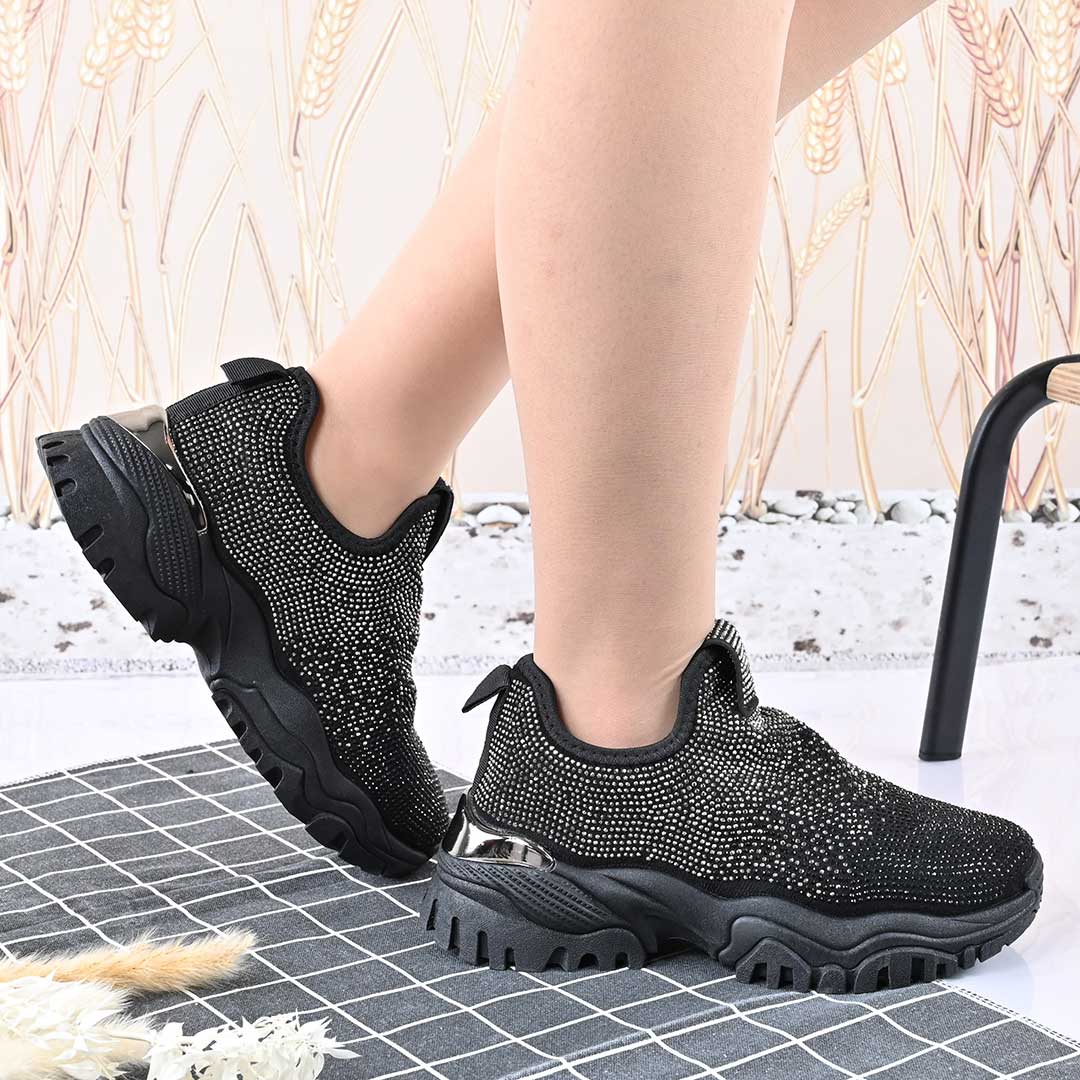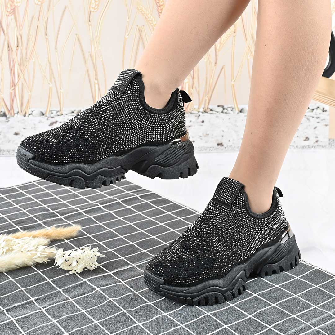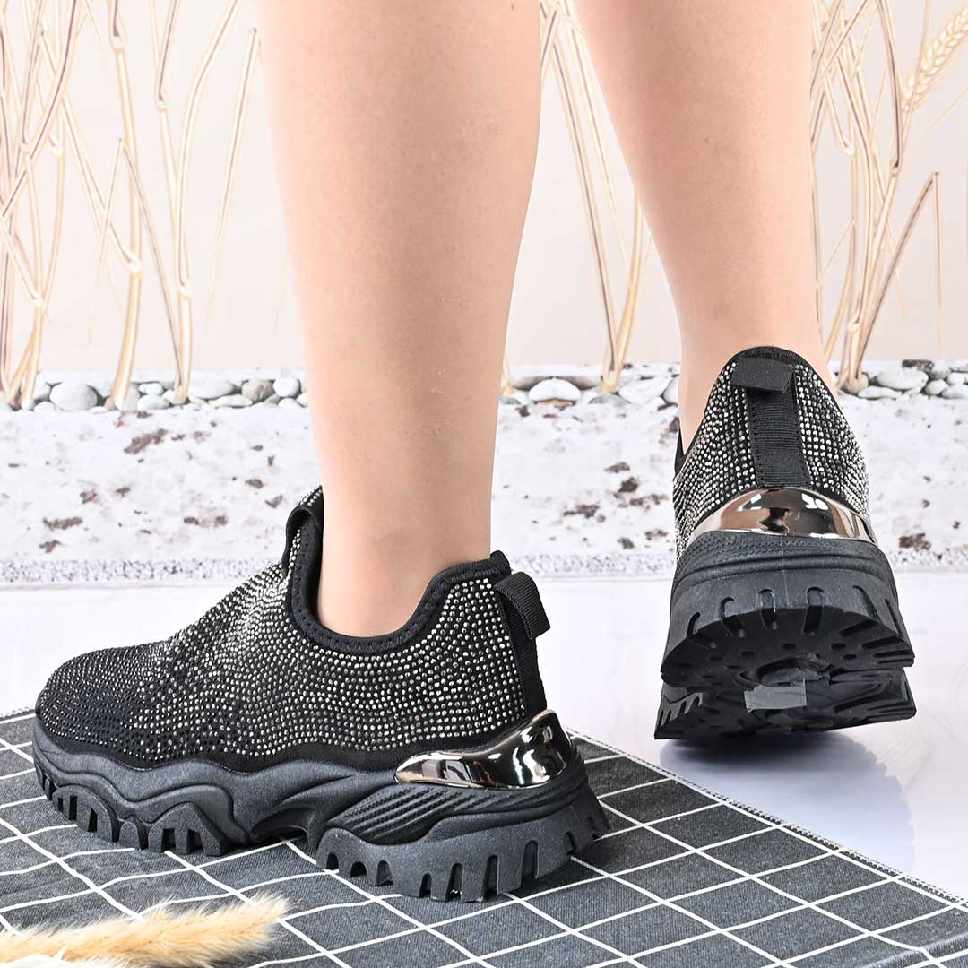 Pantofi Sport De Dama,Cu Material textil si Strasuri,D1441,Negru cu Argintiu