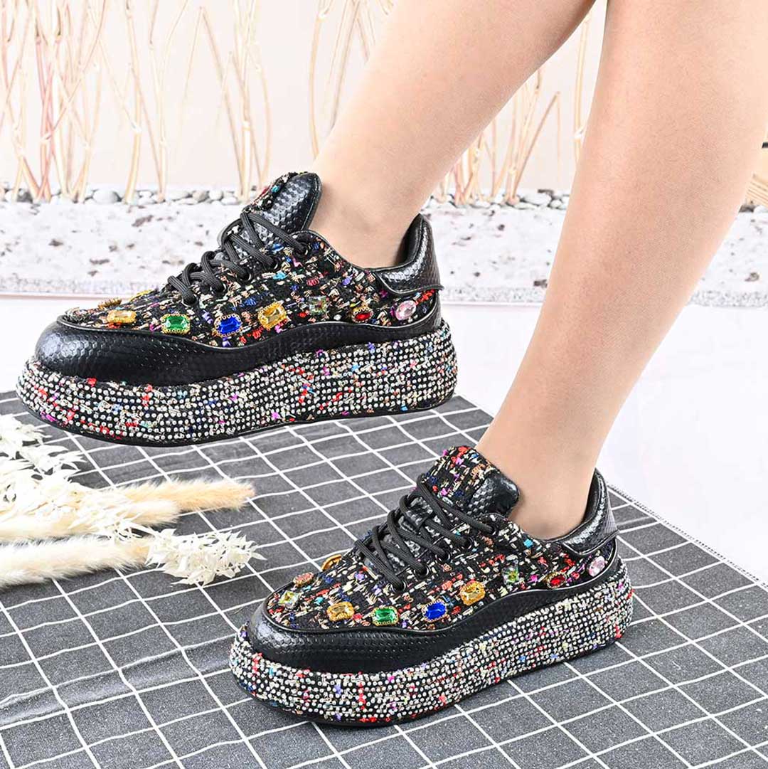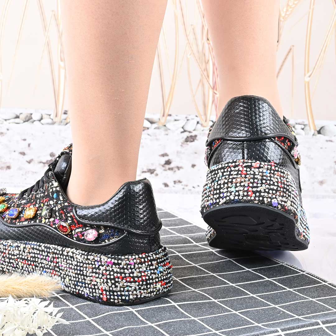 Descoperiți confortul și stilul cu pantofii sport de damă D1418, negri, din piele ecologică, cu strasuri strălucitoare și talpă wedge,...