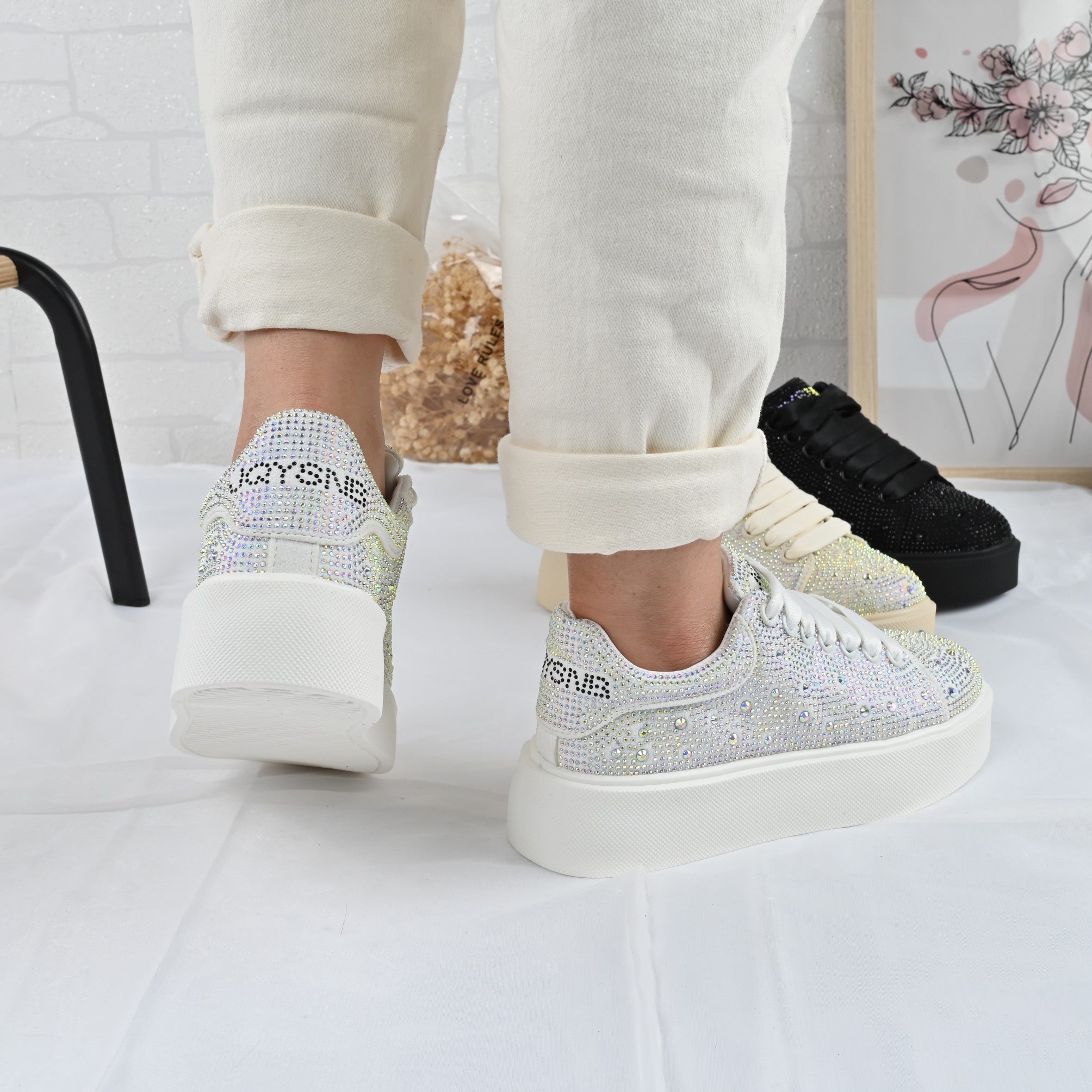 Pantofii sport de damă, confecționați din piele ecologică de calitate, sunt accesorizati cu strasuri strălucitoare. Designul modern și confortul optim...