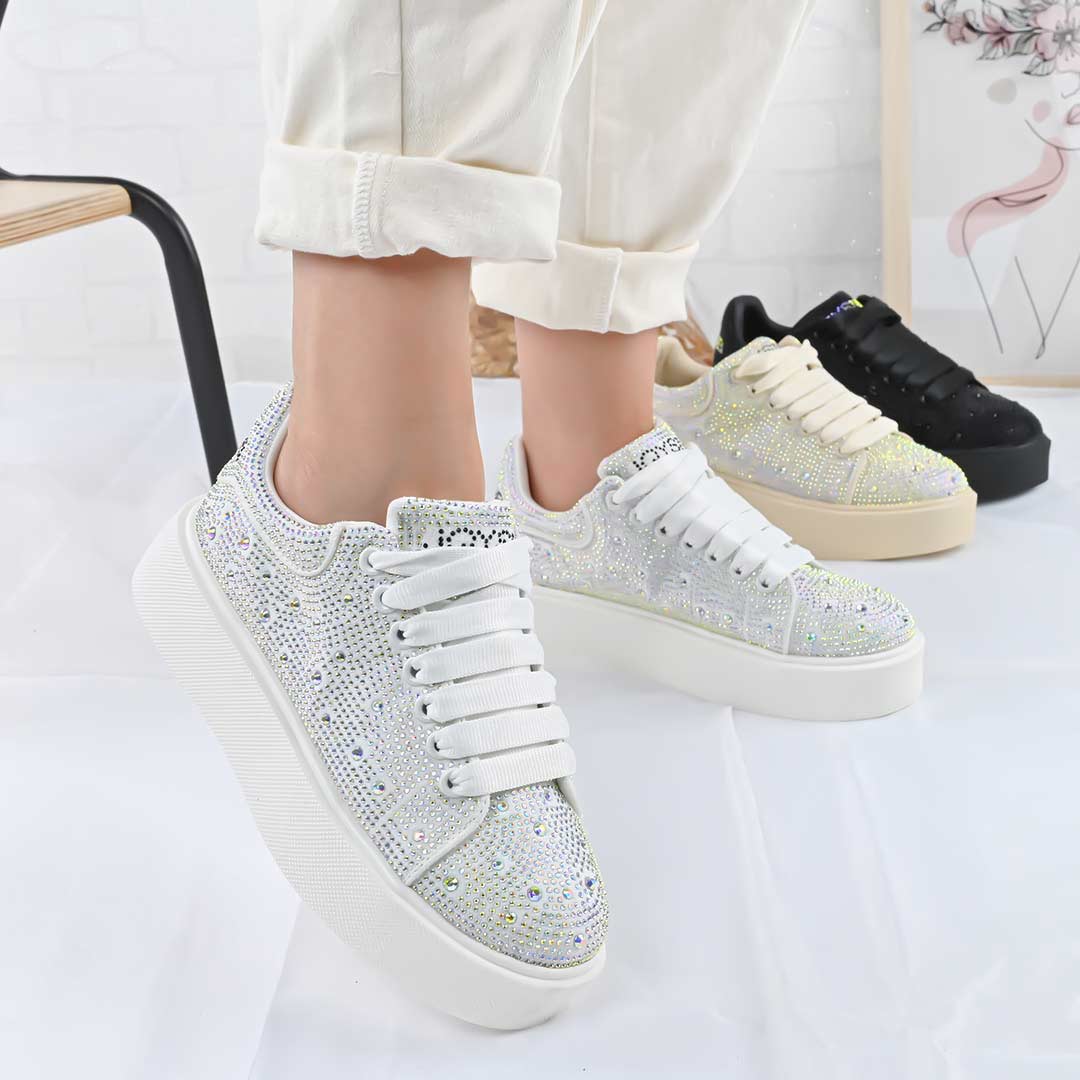 Pantofi Sport De Dama,Din Piele ecologica cu Strasui,D1464,Alb