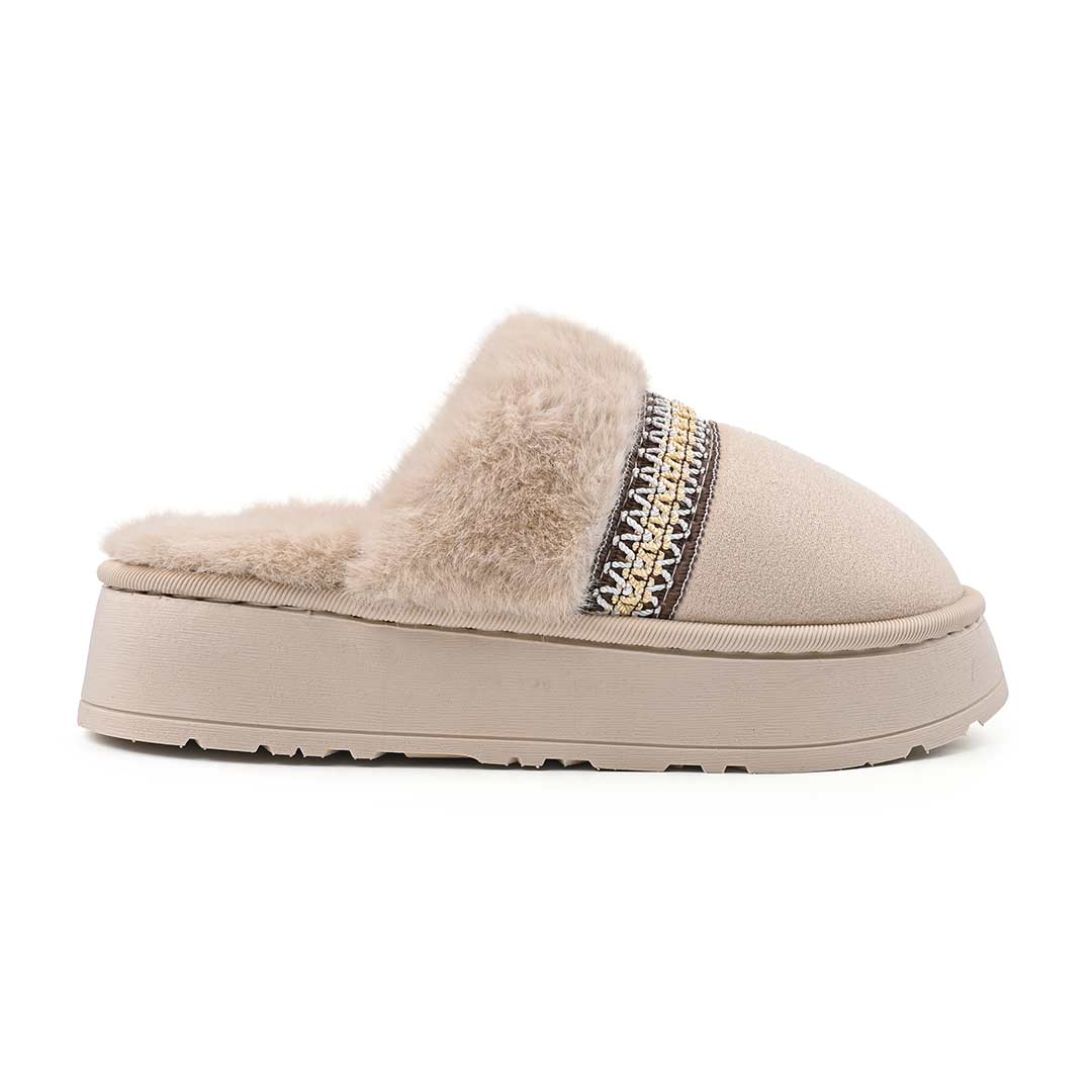 Papuci de casa Dama,Din Piele Ecologica Intoarsa,Imblaniti,PD1056,Bej