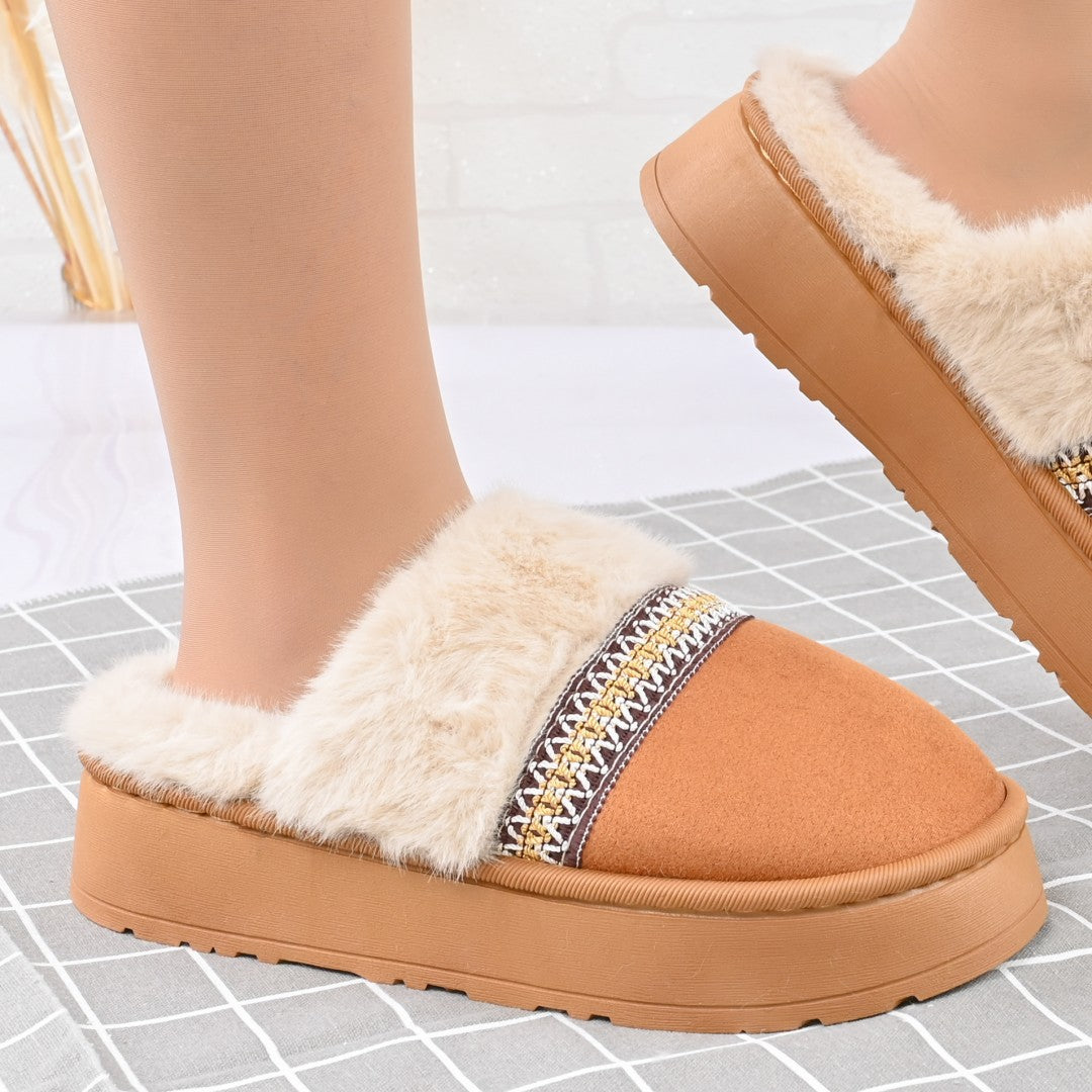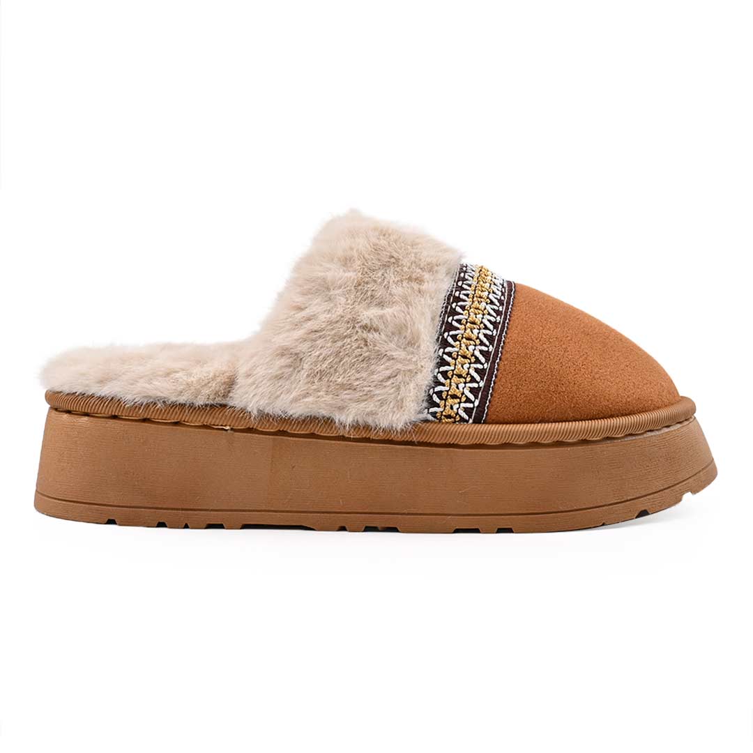 Papuci de casa Dama,Din Piele Ecologica Intoarsa, Imblaniti,PD1056,Camel