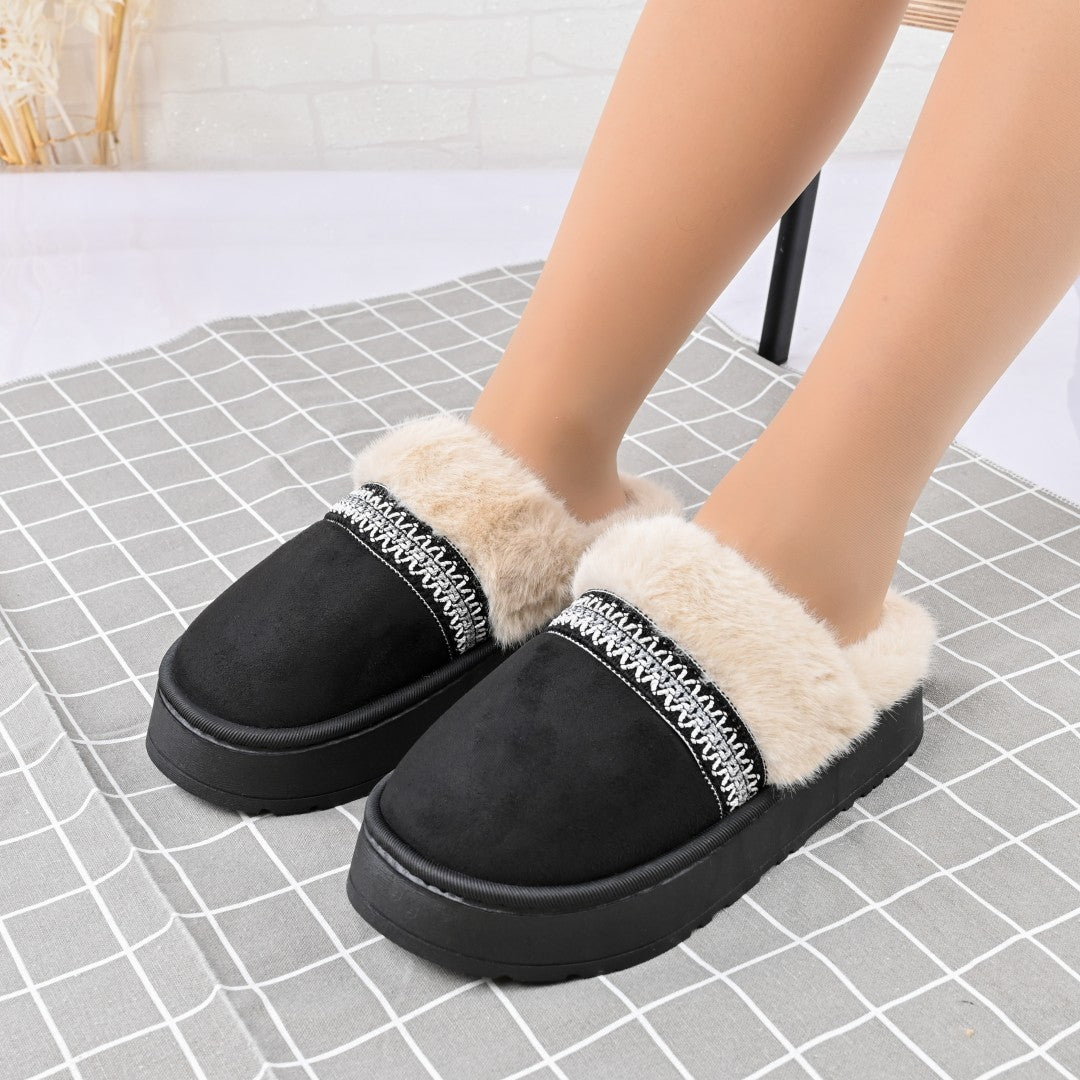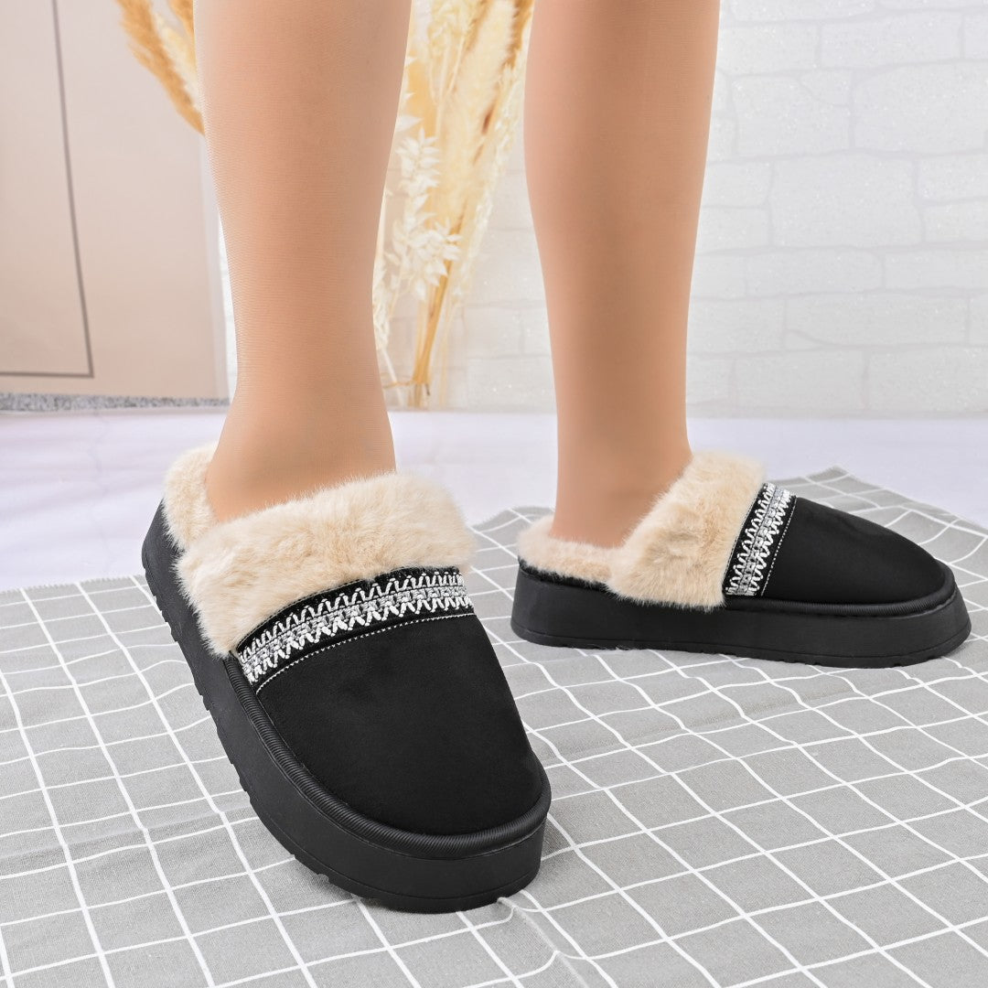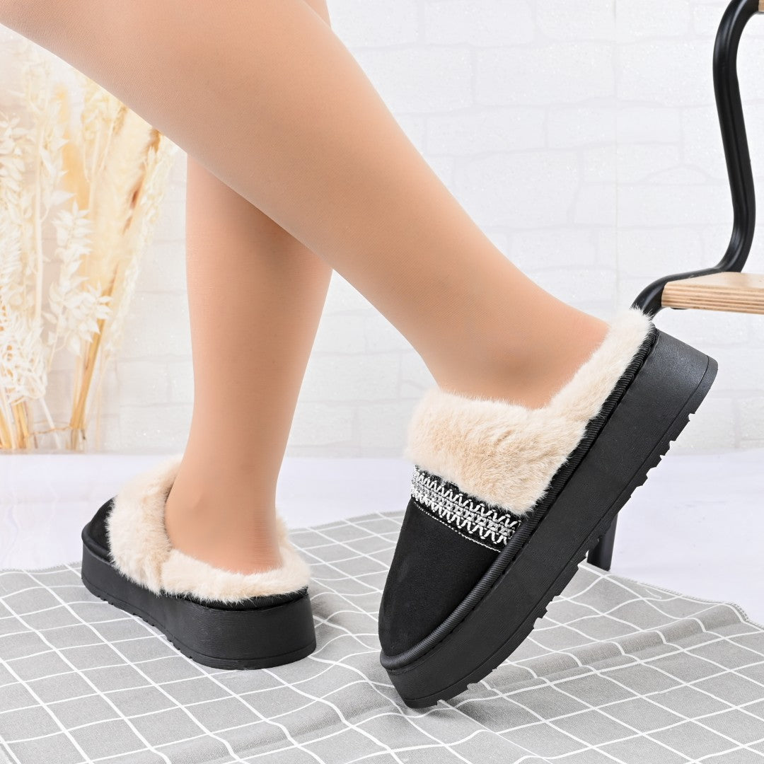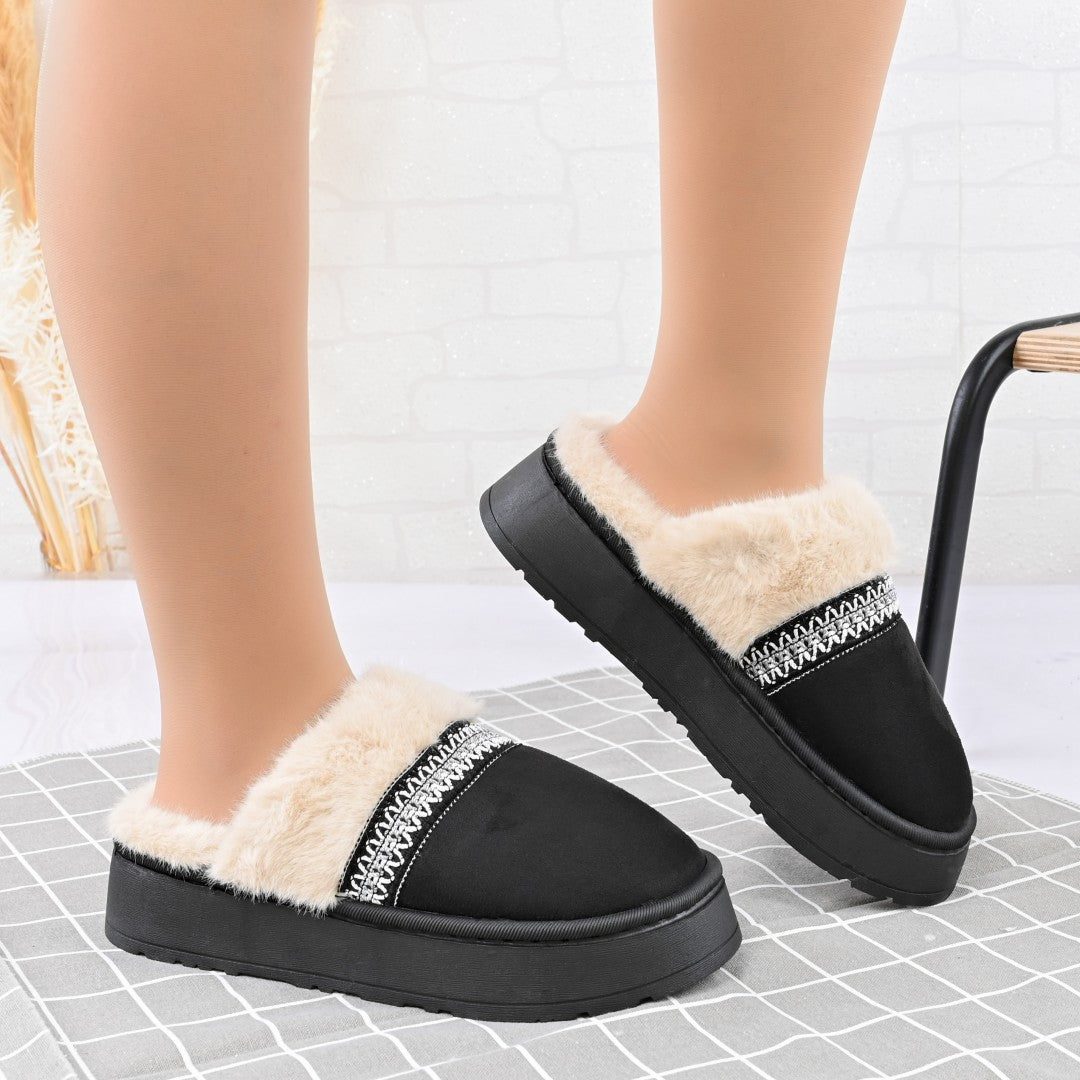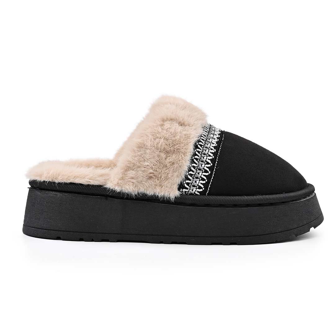Papuci de casa Dama,Din Piele Ecologica Intoarsa, Imblaniti,PD1056,Negru
