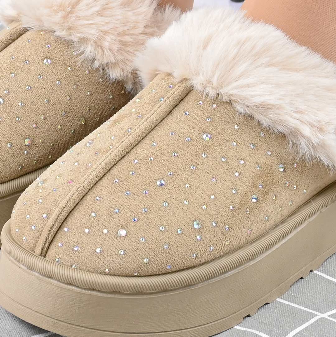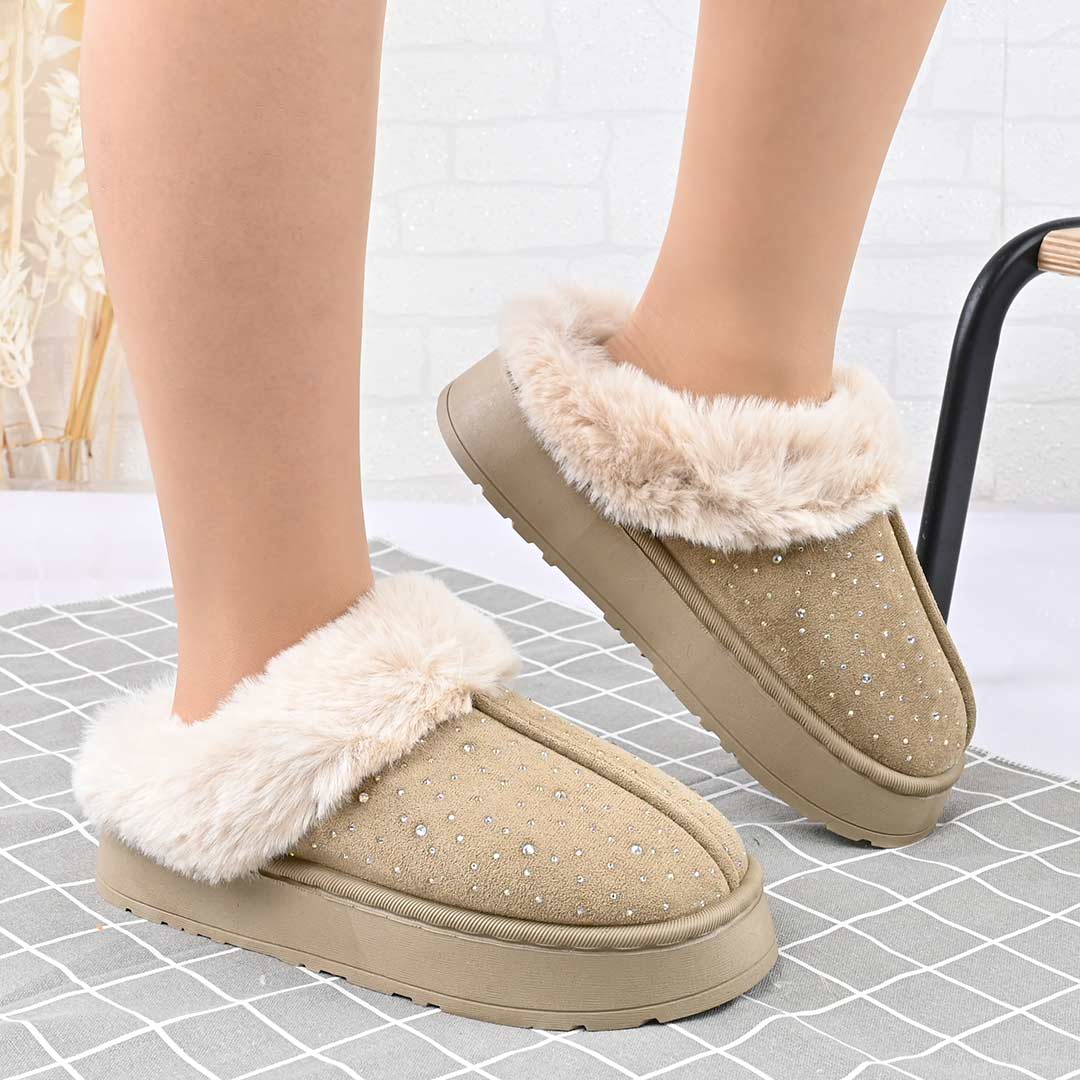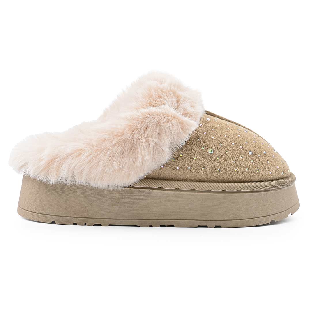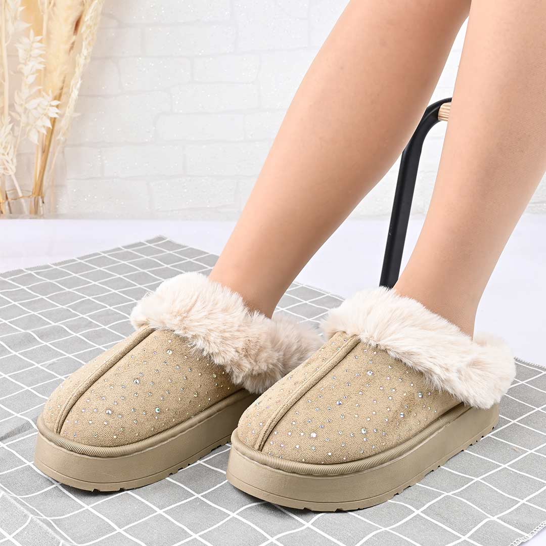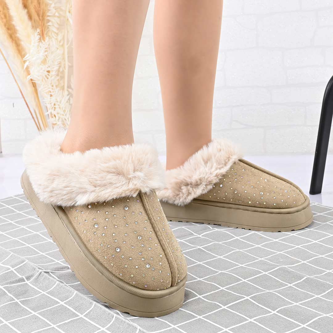 Papuci de casa Dama,Din Piele Ecologica Intoarsa, Imblaniti,PD1059,Kaki
