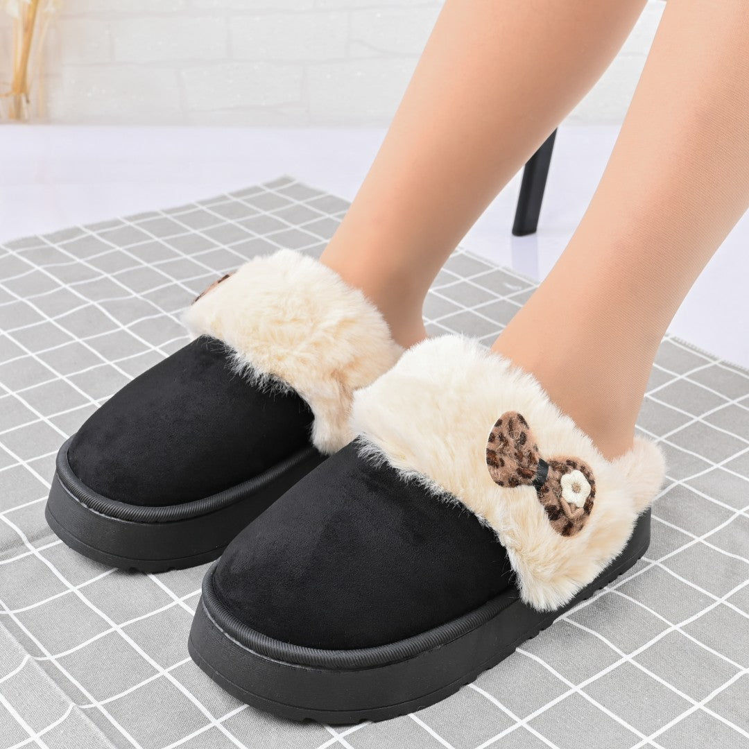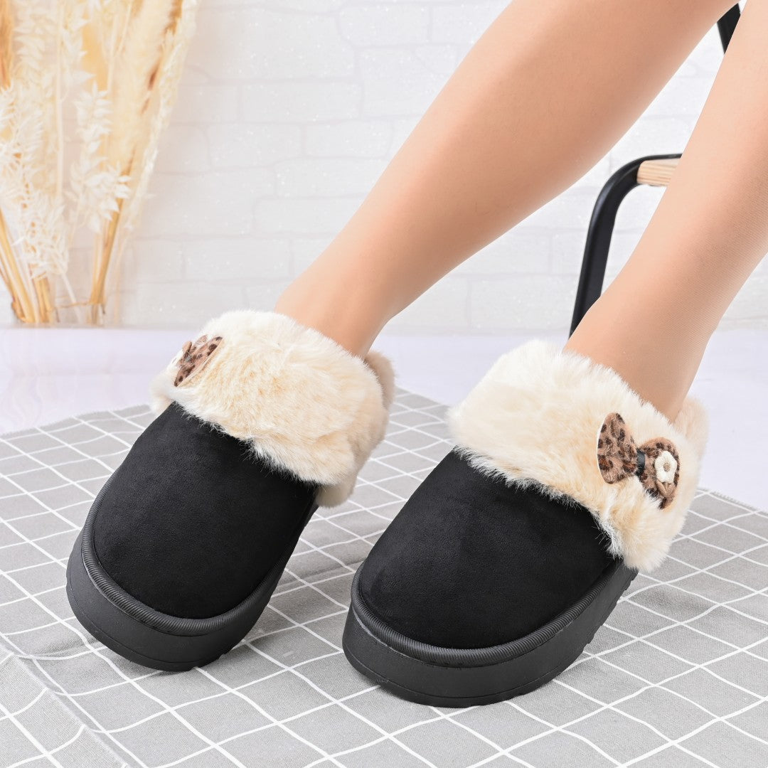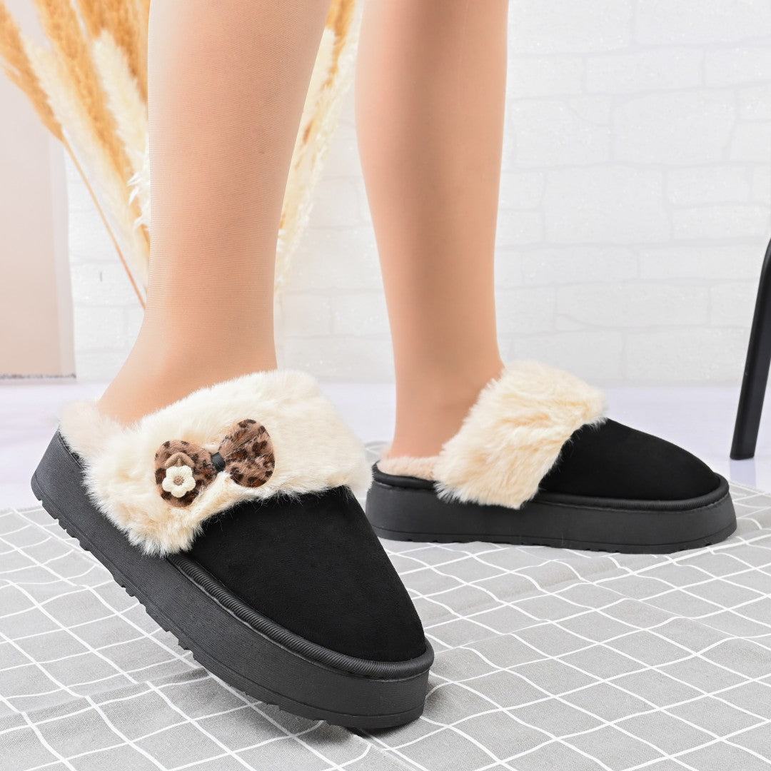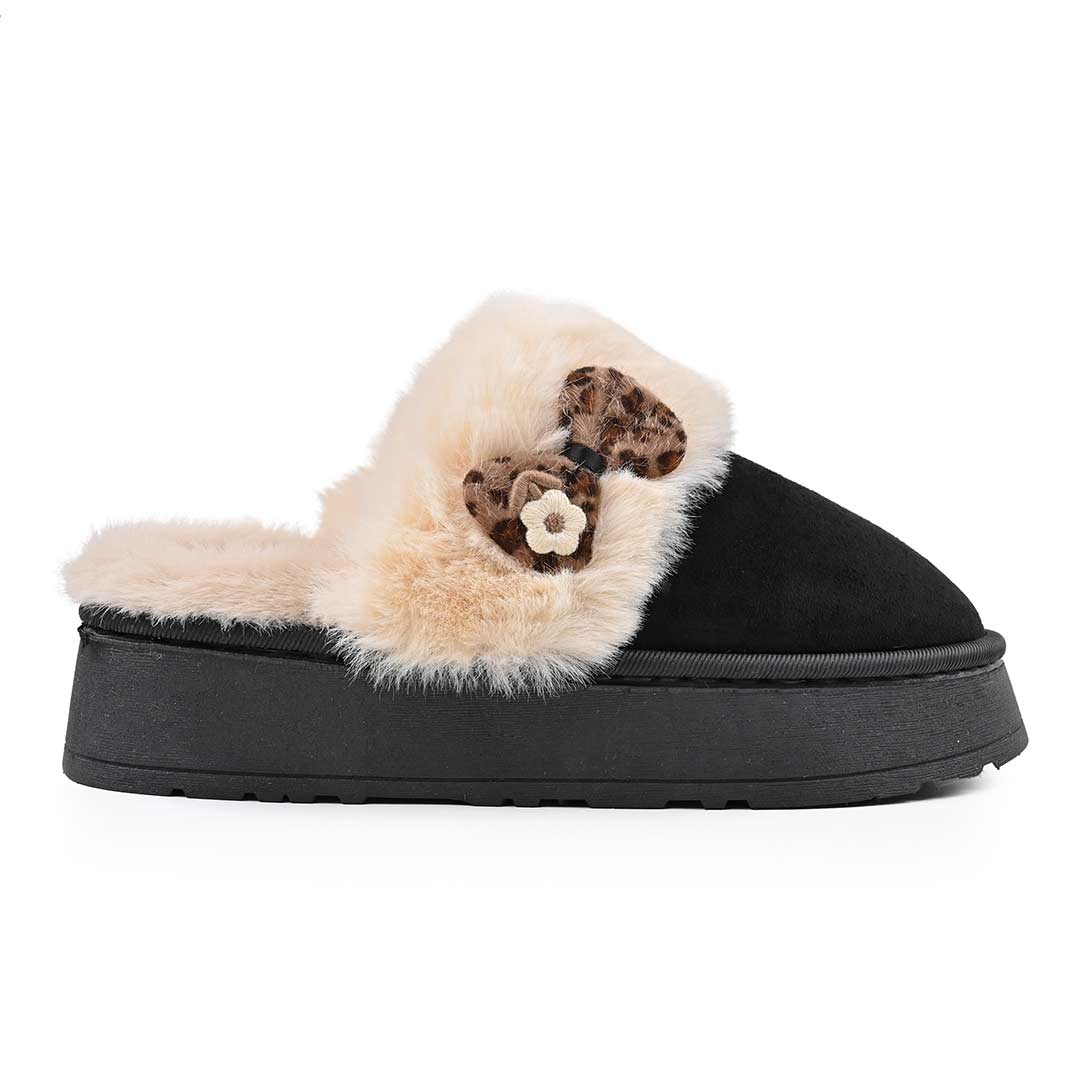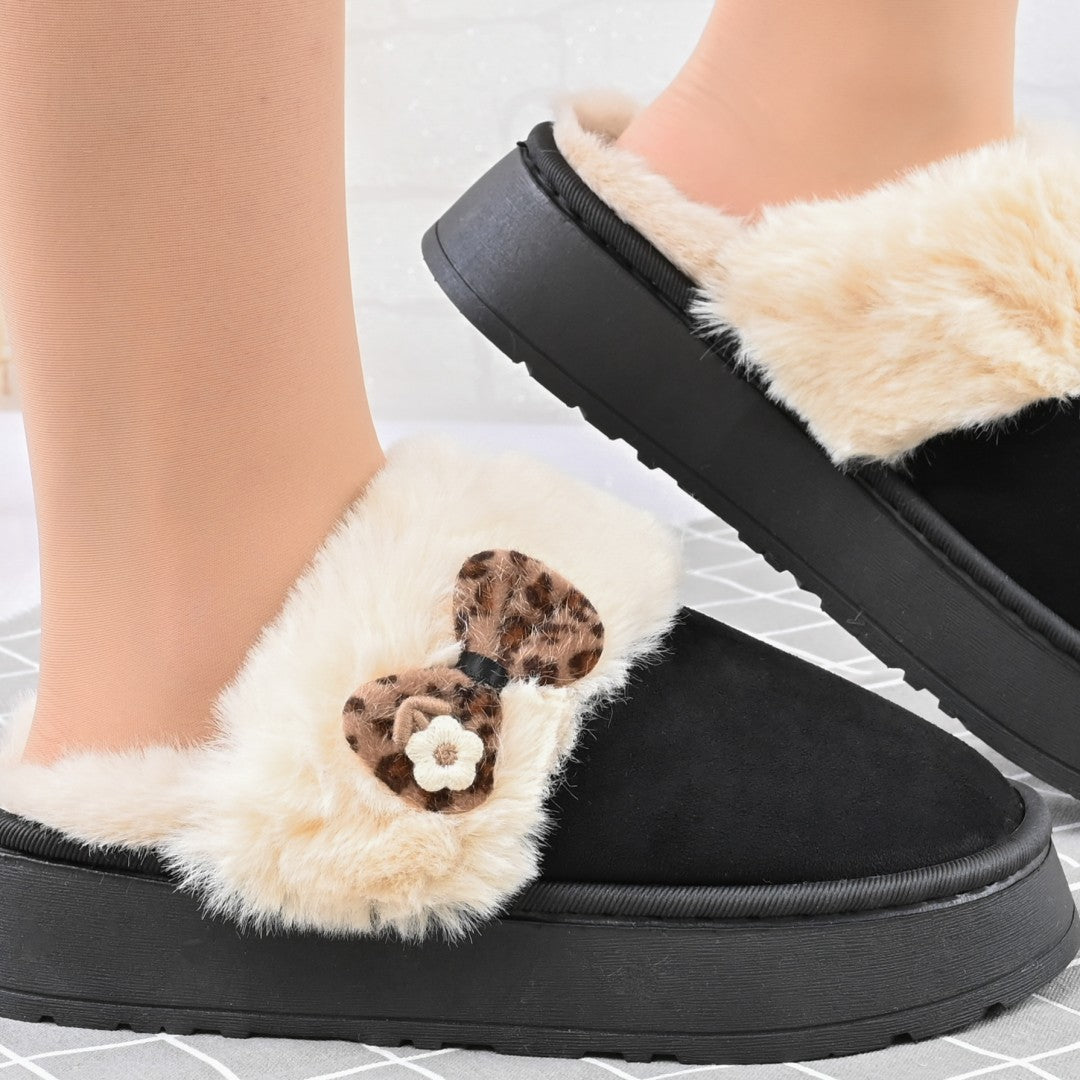 Papuci de casa Dama, pufosi,cu papion leopard, Imblaniti,PD1063,Negru